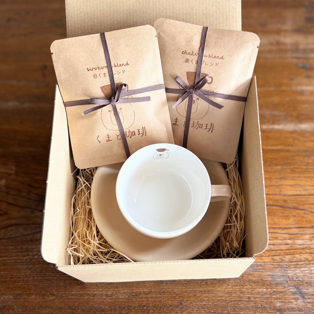 スペシャルティコーヒーを使用したブレンド2種類と、くまと珈琲オリジナルのコーヒーカップ・ソーサーがセットになったギフトです。